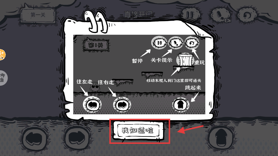 2、点击【我知道啦】按钮,确认教程操作提示,进入第一关“直接开门”的游戏界面。