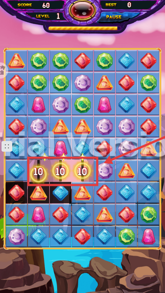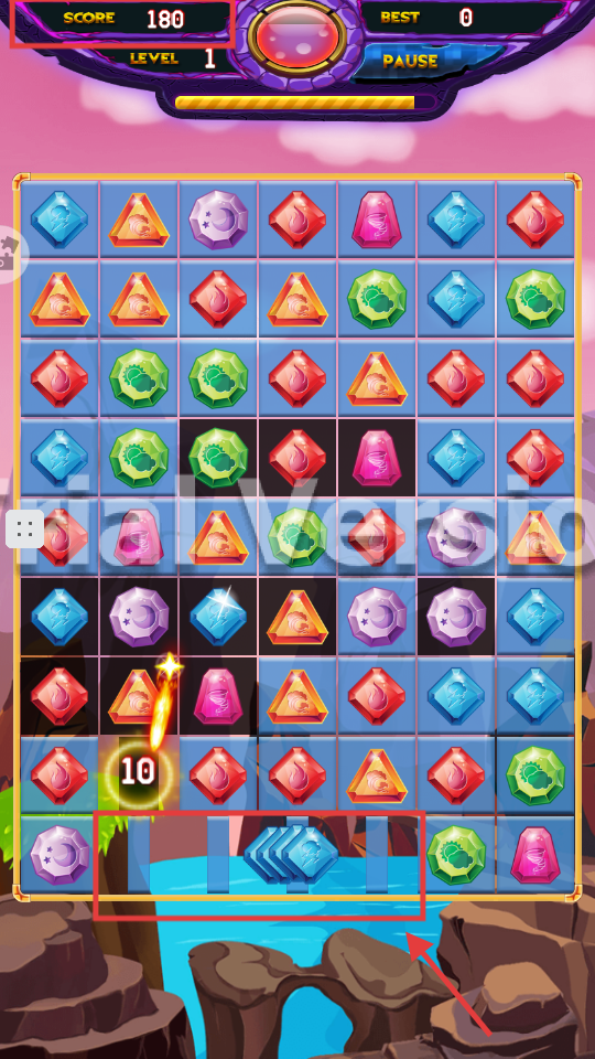 4、消除同色宝石触发连锁,使蓝色宝石掉落,利用连锁反应获取更高分数。