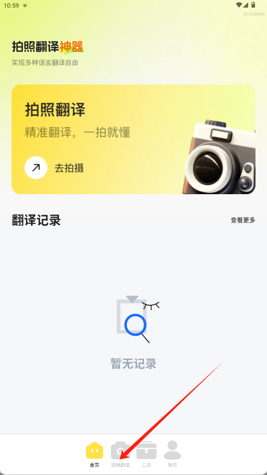 1、在首页点击指向的“拍照翻译”图标进入拍摄界面。
