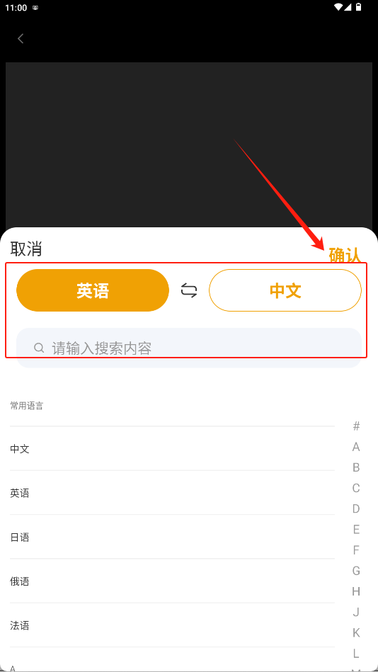 3、在语言选择界面选定源语言与目标语言后点击右上角“确认”完成翻译。