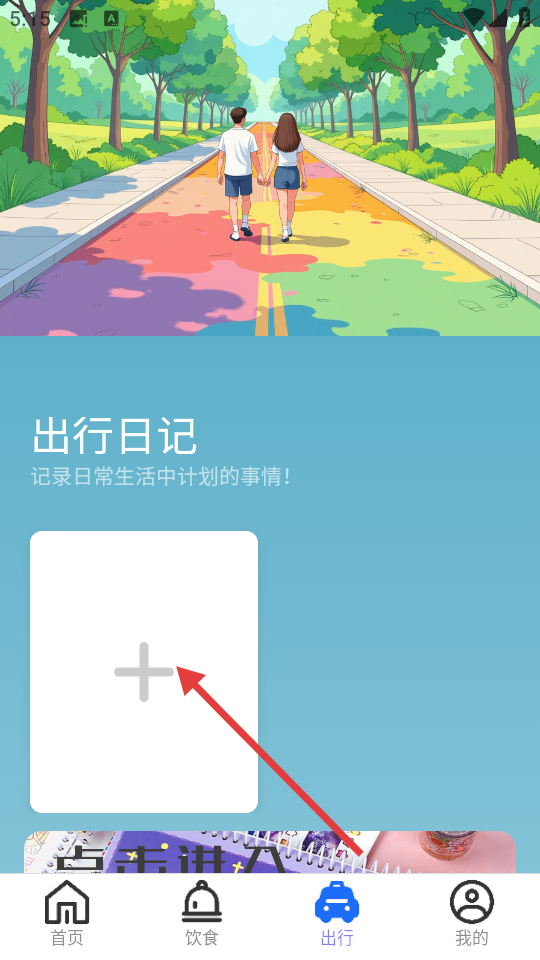 3、进入出行页面,点击【出行日记】中的“+”号,进入日记编辑页面。