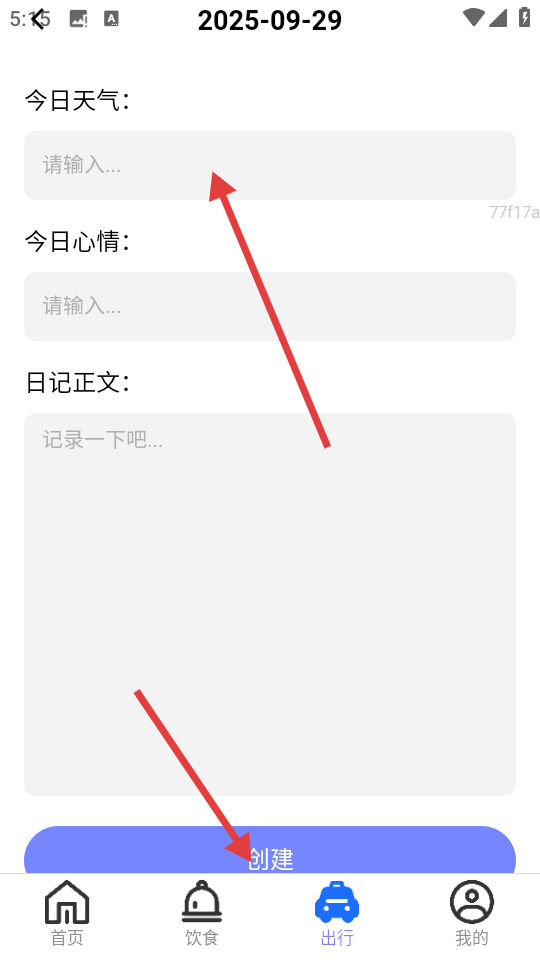 4、在日记编辑页面,输入今日天气、心情、日记正文等内容,完成后点击【创建】,保存出行日记。