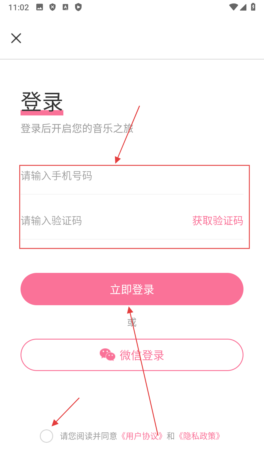 4、输入【手机号码、获取并输入验证码】勾选【协议】后,点击【立即登录】,即可完成账号登录操作。