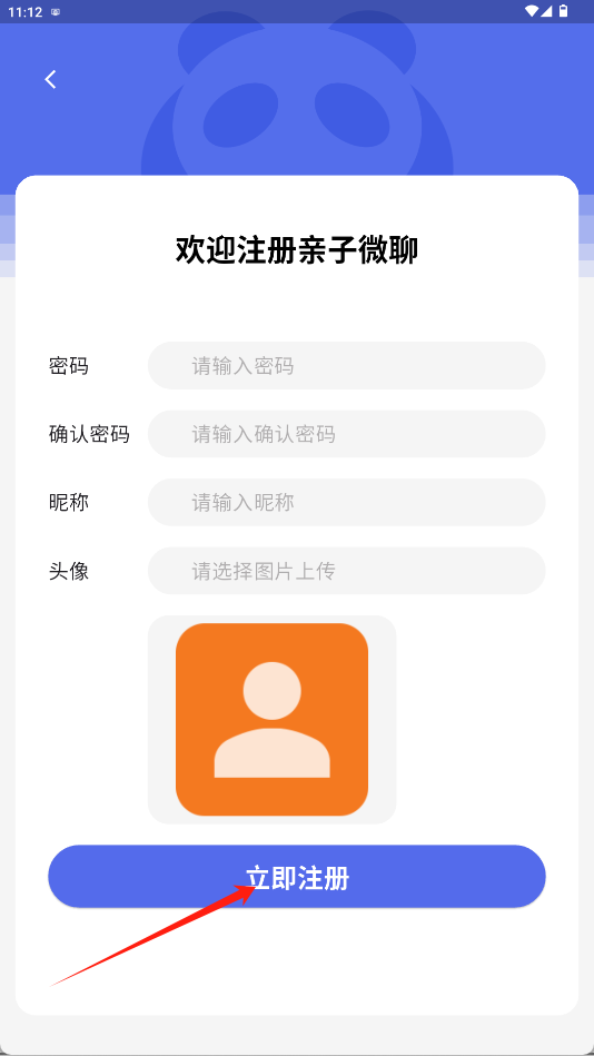 2、在注册页面填写密码、昵称并上传头像后,点击指示的“立即注册”按钮。