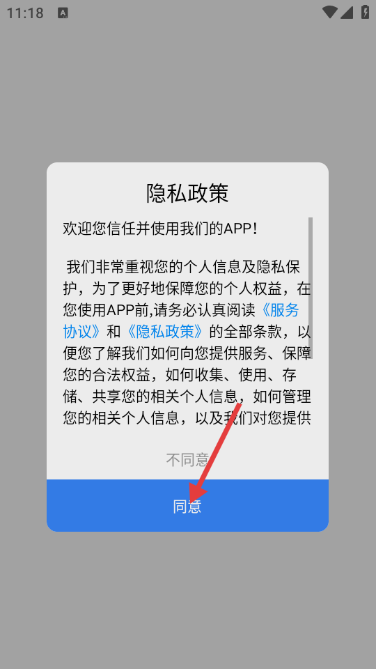 1、打开APP,在隐私政策弹窗中点击【同意】。