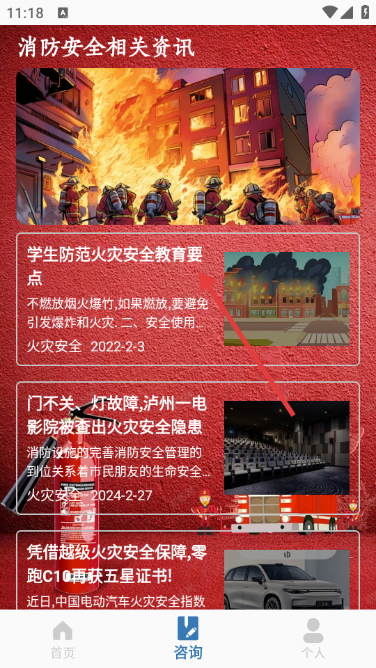 3、进入咨询页面,可浏览消防安全相关资讯,选择感兴趣的资讯点击进入。