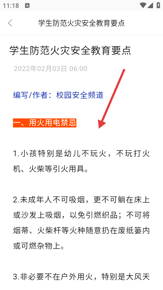 4、进入后,可查看该资讯的详细内容,学习学生防范火灾的安全教育知识。