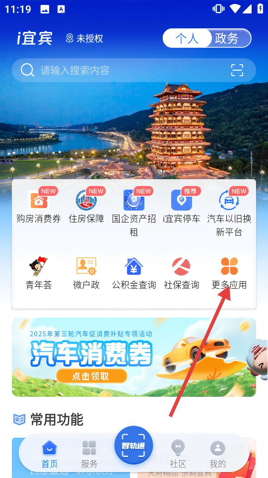 1、打开“i宜宾”APP首页,点击【更多应用】,进入应用选择页面。