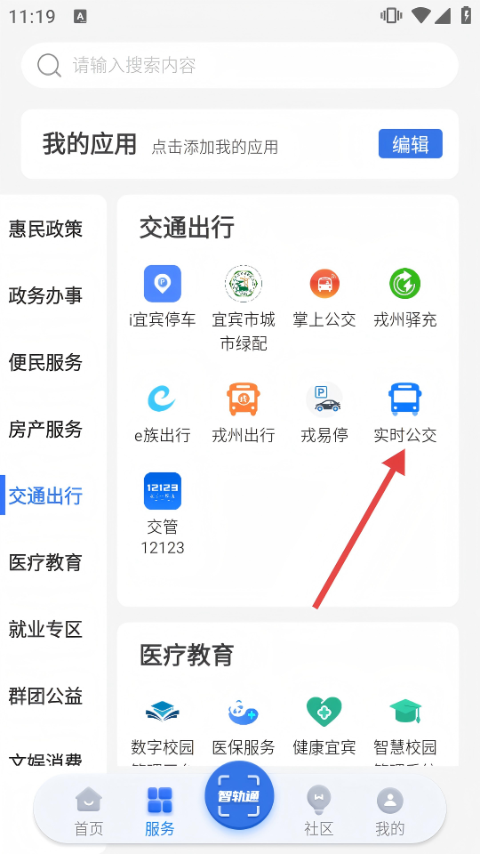 2、在应用页面的“交通出行”分类里,点击【实时公交】,进入实时公交查询界面。