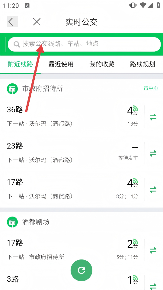 3、在实时公交界面的搜索框,输入需查询的公交线路、车站或地点。