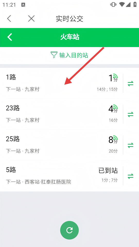 4、搜索完成后,就能查看对应公交线路的实时到站情况,比如“火车站”相关公交的到站时间等。