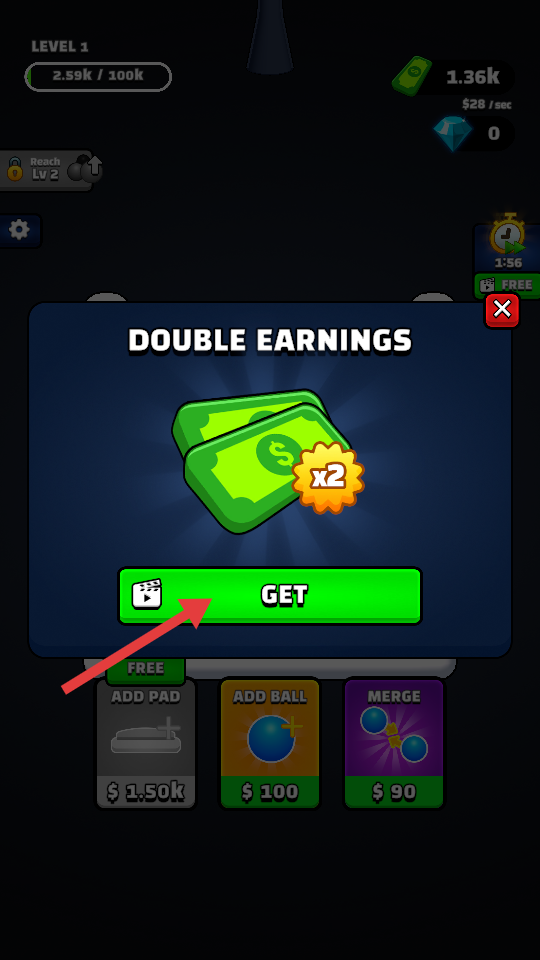 4、点击【GET】,通过观看视频,获得【DOUBLE-EARNINGS】,让金币收益翻倍,加快资源积累。