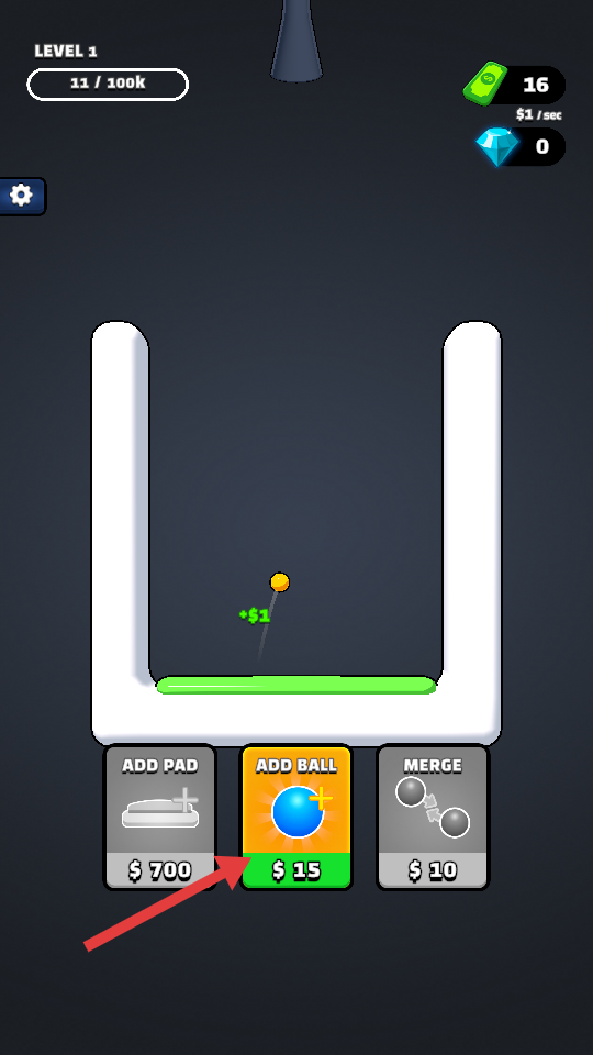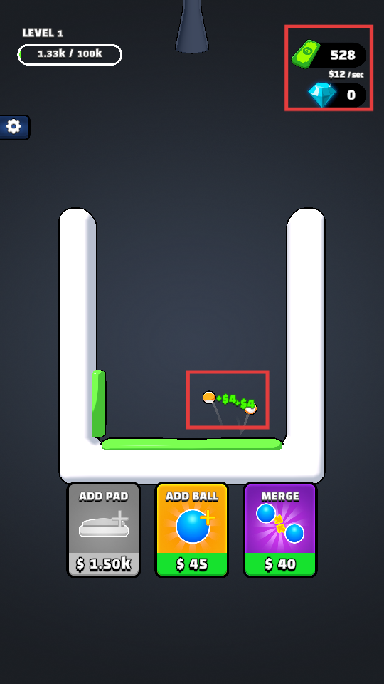 1、点击【ADD-BALL】,花费金币添加小球,让小球在区域内弹跳获取金币,推进关卡进度。