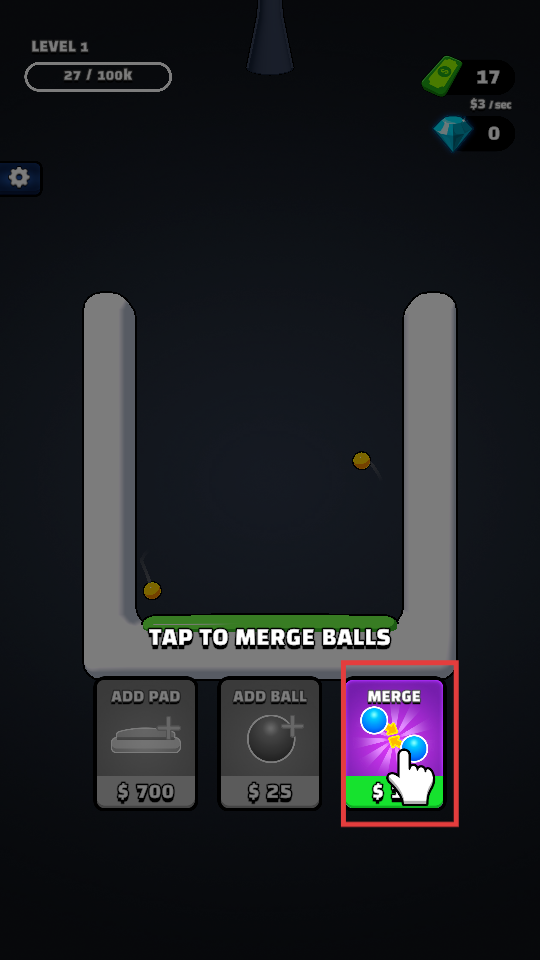 2、按照提示【TAP-TO-MERGE-BALLS】,点击【MERGE】,合并小球,提升获取金币的效率。