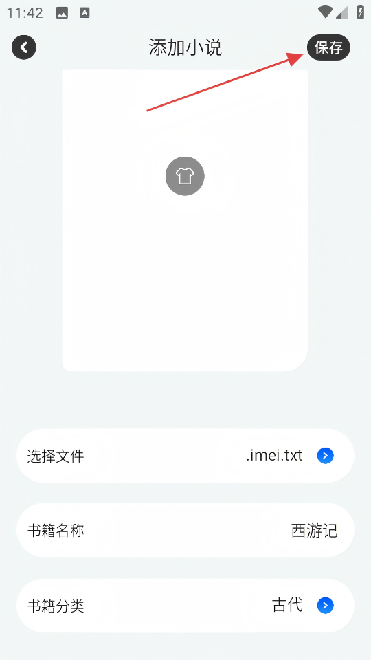 3、在“添加小说”页面,设置好文件、书籍名称、书籍分类后,点击右上角【保存】。