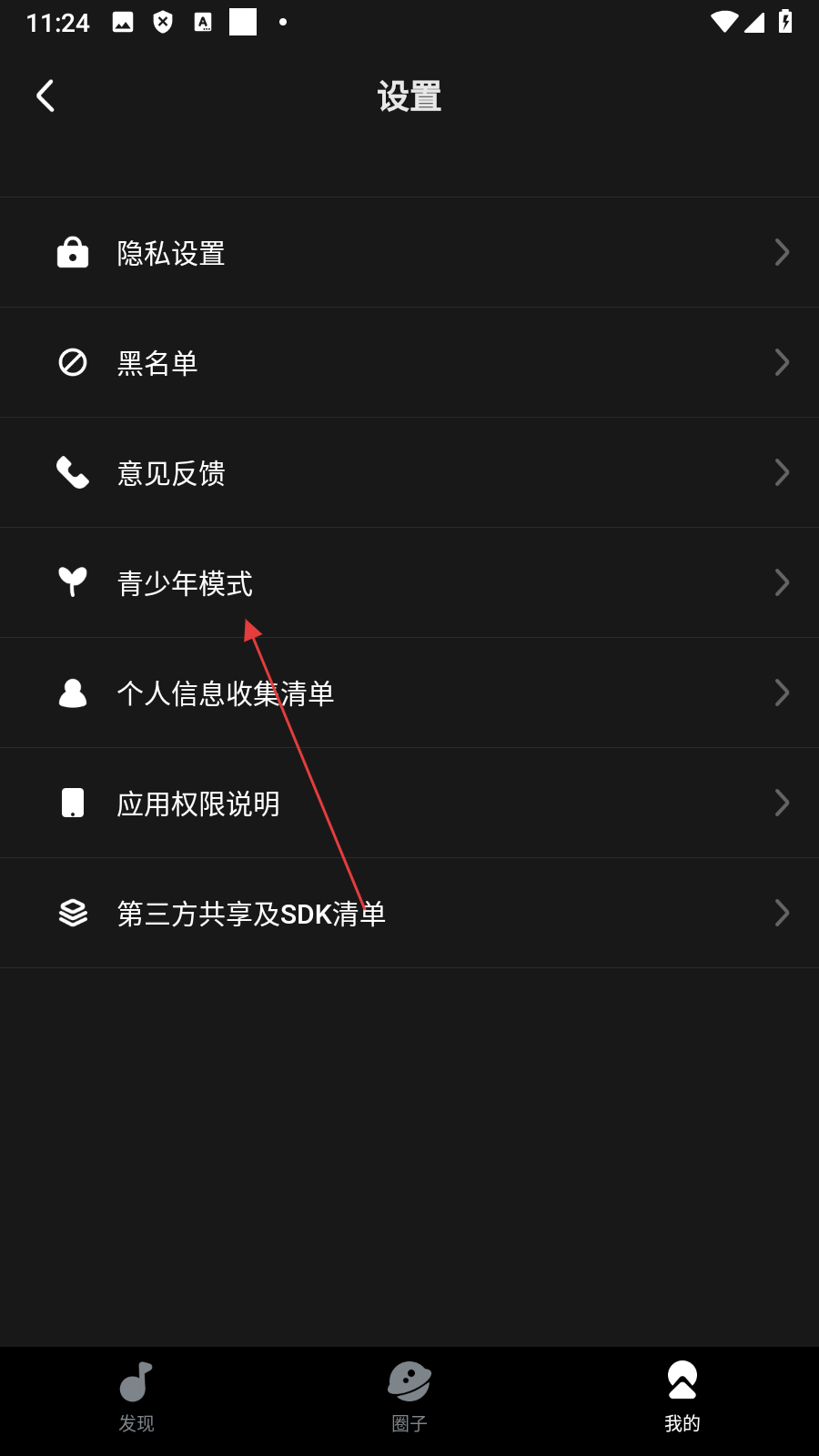 4、在设置页面,点击【青少年模式】,即可进入青少年模式打开设置。