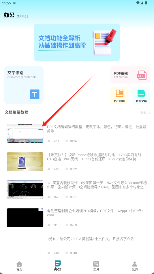 2、在办公页面选择“PDF编辑”板块查找并点击“PDF文档编辑详细教程”入口。