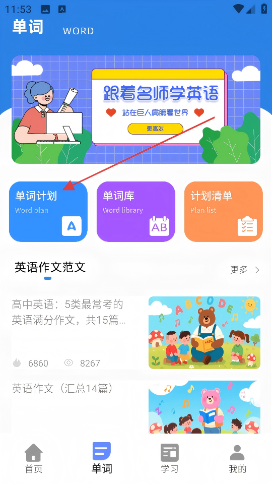 2、在单词学习页面,点击【单词计划】,进入学习计划界面。