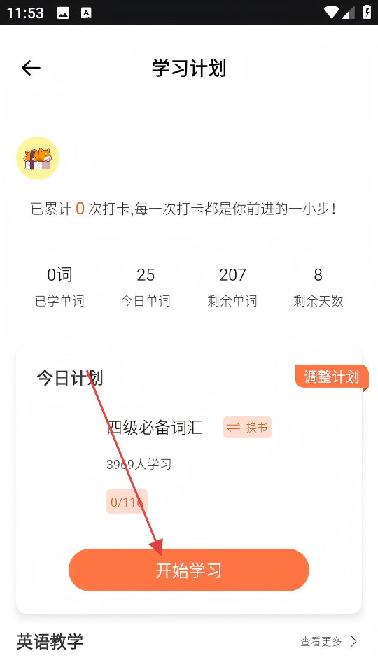 3、在学习计划界面,点击【开始学习】,进入词汇学习环节。