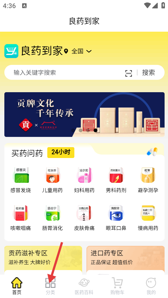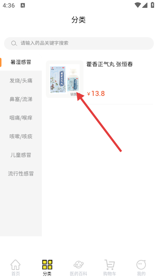 2、进入分类页面,选择药品分类,找到想要购买的药品,点击进入。
