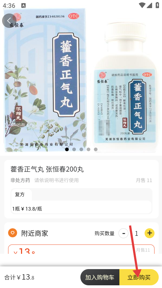 3、进入药品详情页面,可查看药品信息、价格等,点击【立即购买】。