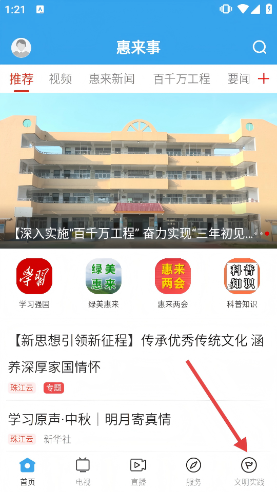 1、打开“惠来事”APP首页,点击底部【文明实践】,进入文明实践页面。