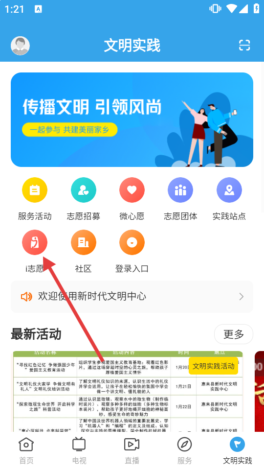 2、在文明实践页面,点击【i志愿】,进入志愿相关界面。