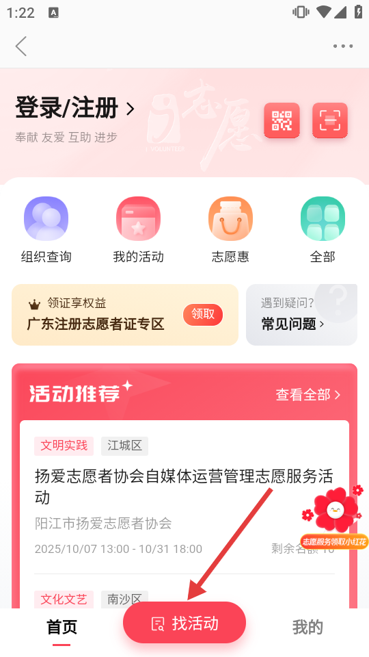 3、在志愿界面,点击【找活动】,进入活动广场页面。