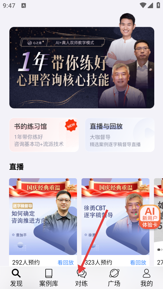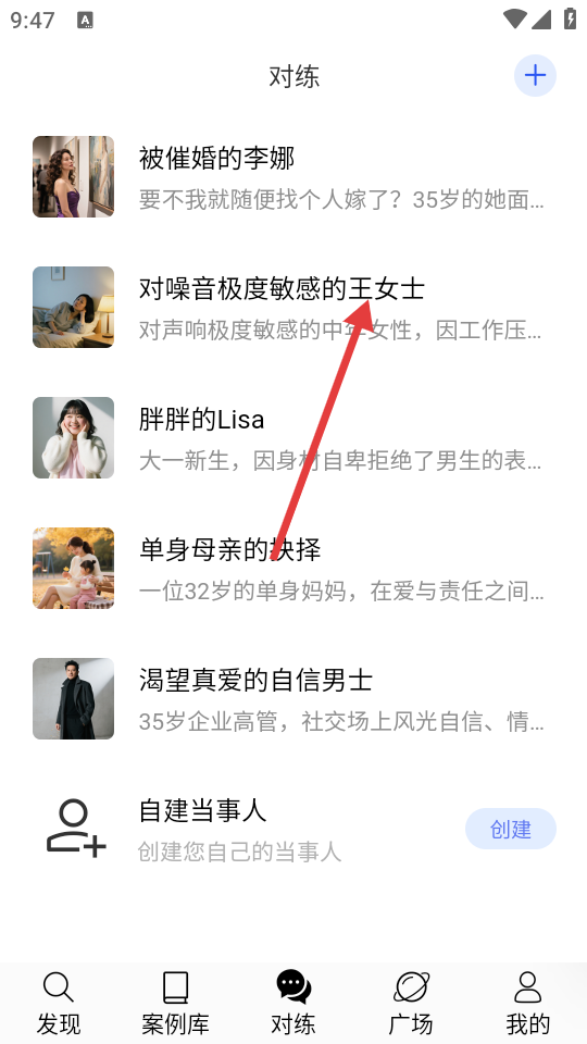 2、进入对练页面,选择想要练习的案例,如【对噪音极度敏感的王女士】点击进入。