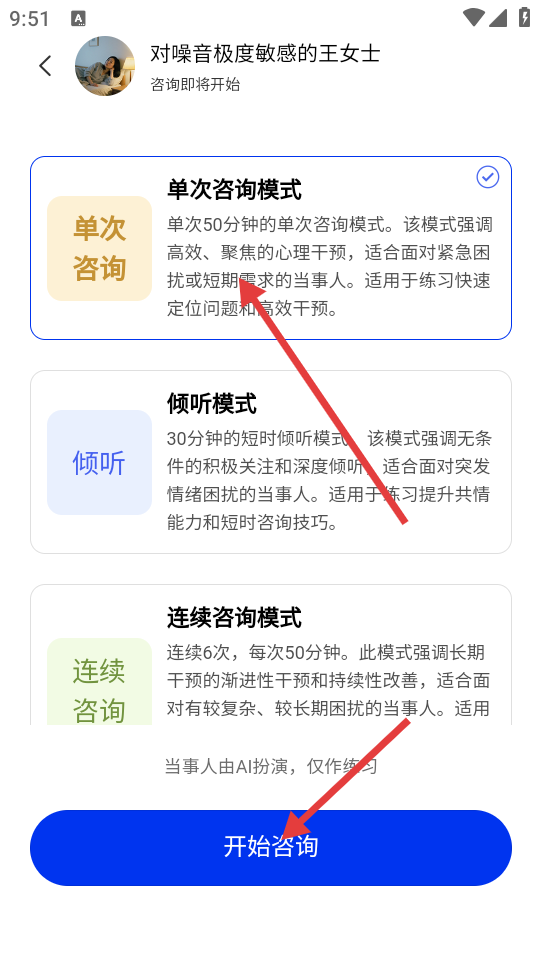 3、进入案例咨询模式选择页面,选择咨询模式(如单次咨询模式),点击【开始咨询】。