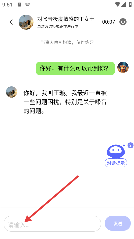 4、进入咨询对话页面,在输入框中输入想要和当事人交流的内容,点击【发送】,进行心理咨询练习。