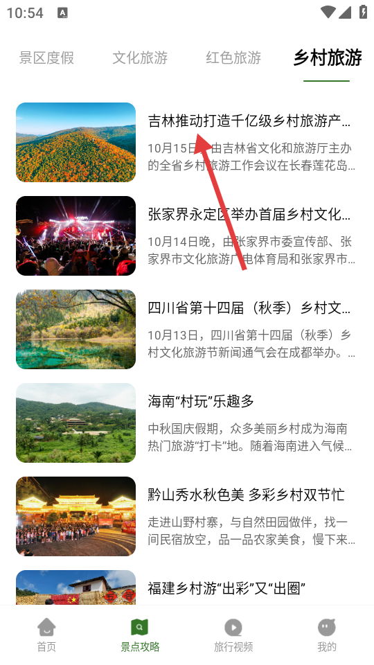 3、进入景点攻略页面,选择旅游分类(如乡村旅游),点击感兴趣的资讯进入。