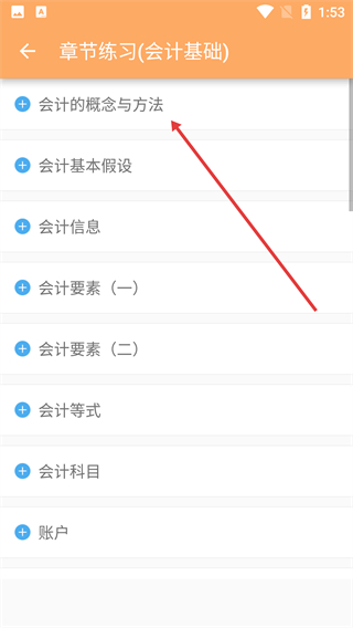 2、进入章节练习页面后,点击【会计的概念与方法】选项。