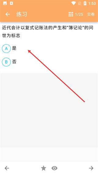 4、在练习页面可以开始答题,如题目“近代会计以复式记账法的产生和‘簿记论’的问世为标志”,答案选A“是”。