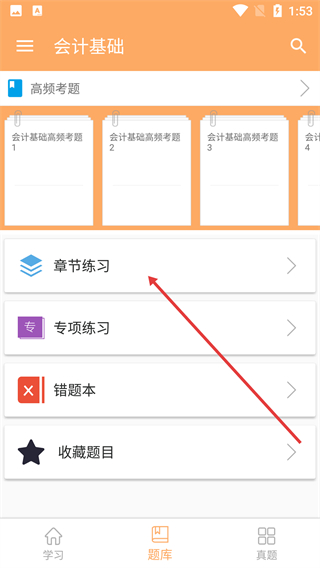 1、在“会计基础”题库页面,点击【章节练习】选项。