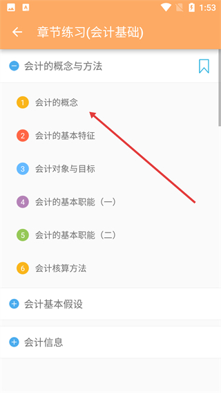 3、展开后,点击【会计的概念】选项,进入练习页面。