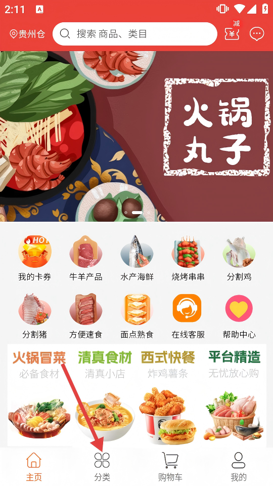 1、打开食材购物APP首页,点击底部【分类】,进入商品分类页面。