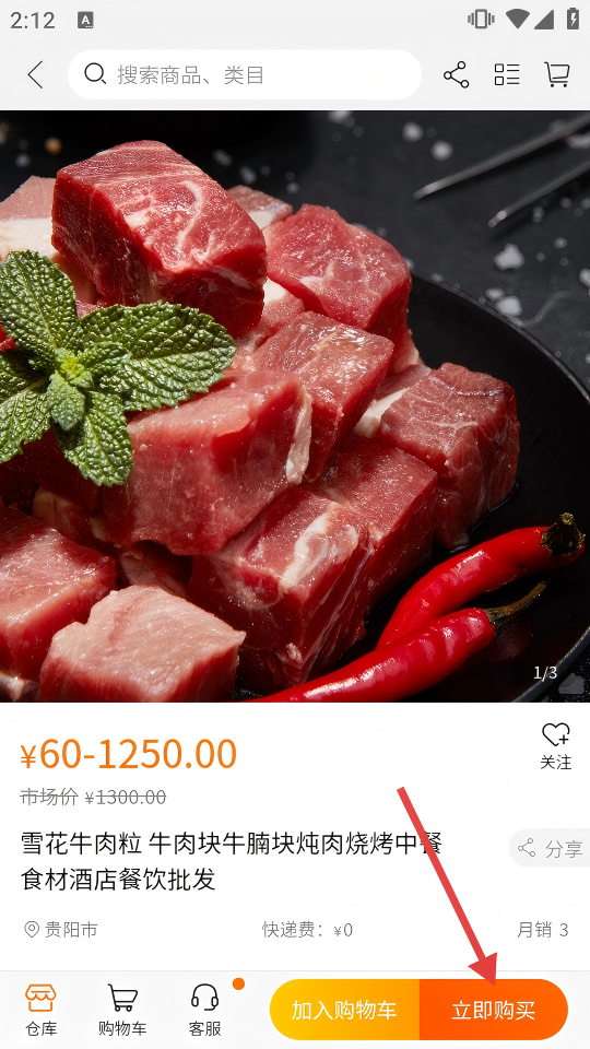 4、在商品详情页,点击【立即购买】,即可下单该牛肉类商品。