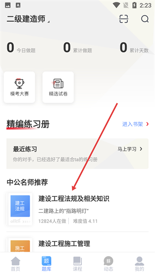 3、在题库页面的“中公名师推荐”板块下,点击【建设工程法规及相关知识】选项,进入练习册详情页。