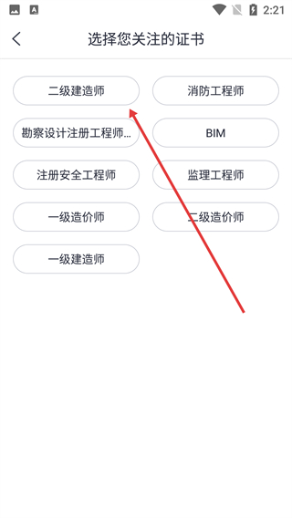 1、在“选择您关注的证书”页面,点击【二级建造师】选项,进入二级建造师相关页面。