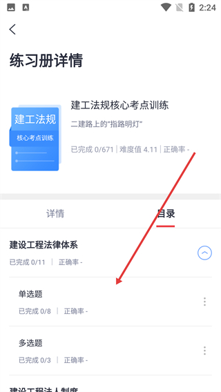 4、在练习册详情页的“目录”标签下,可选择“建设工程法律体系”下的“单选题”等题型进行练习。
