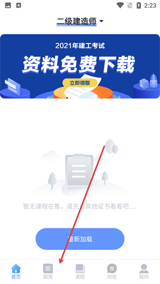 2、在二级建造师页面,点击底部【题库】选项,进入题库页面。