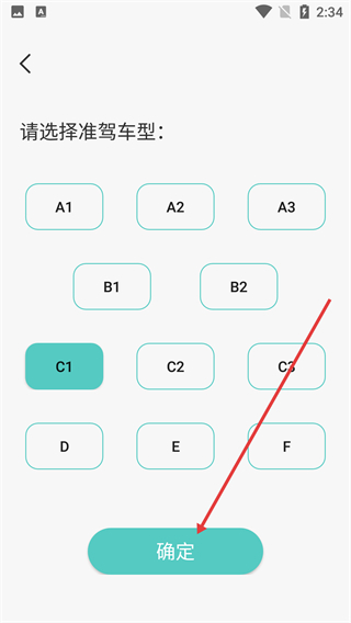 1、选择准驾车型(如点击【C1】),然后点击【确定】按钮。