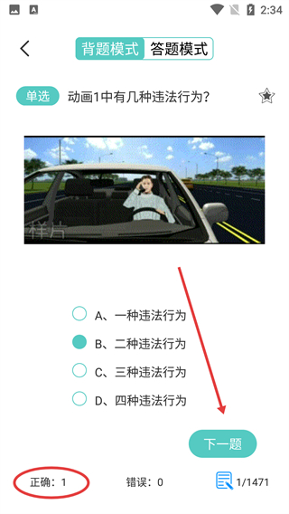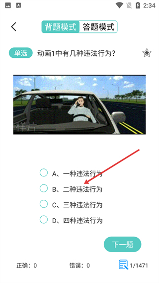 3、在背题模式下,看到题目“动画1中有几种违法行为?”,选择对应的选项(如B选项“二种违法行为”)。