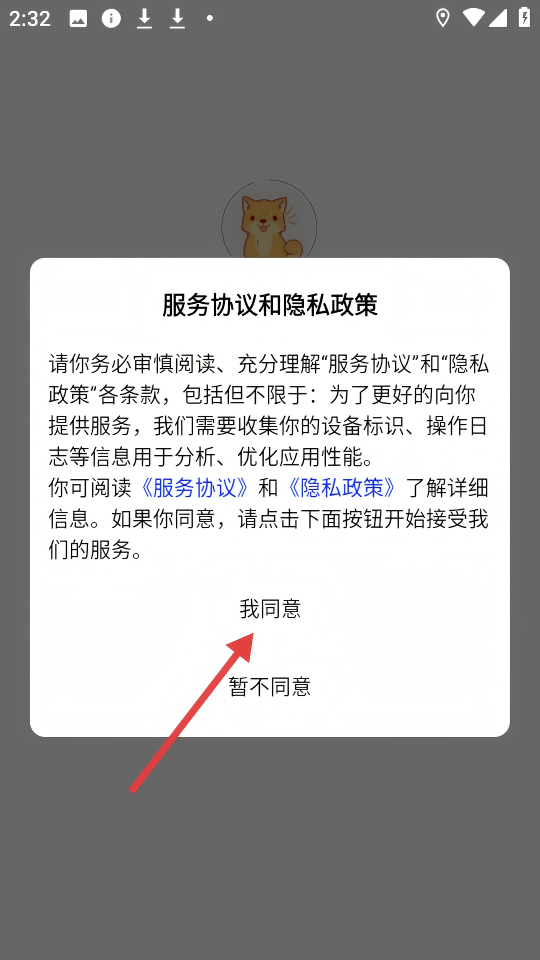 1、在服务协议和隐私政策弹窗中,点击【我同意】,同意相关协议。