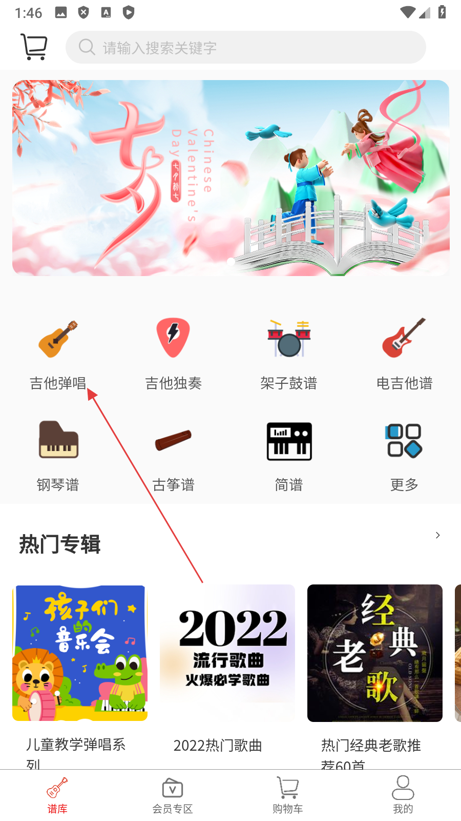 1、在谱库首页,点击【吉他弹唱】,进入吉他弹唱曲谱列表页面。