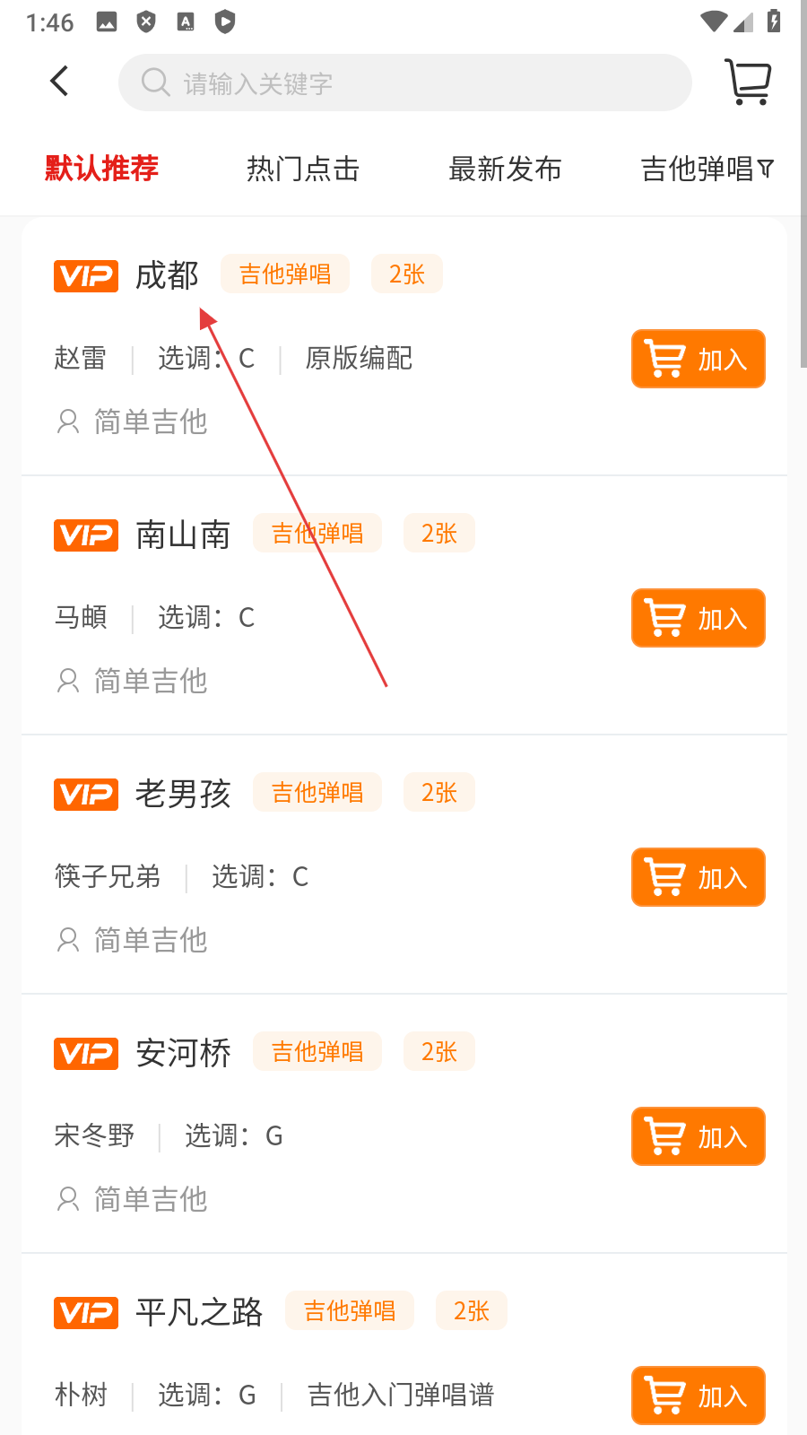 2、在曲谱列表页面,点击【需要的曲谱】,进入该曲谱详情页面。
