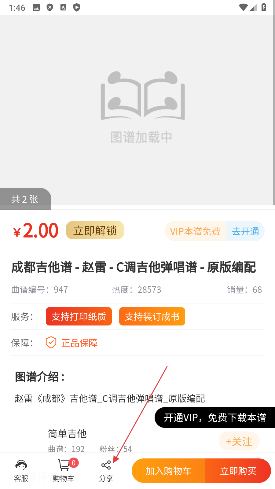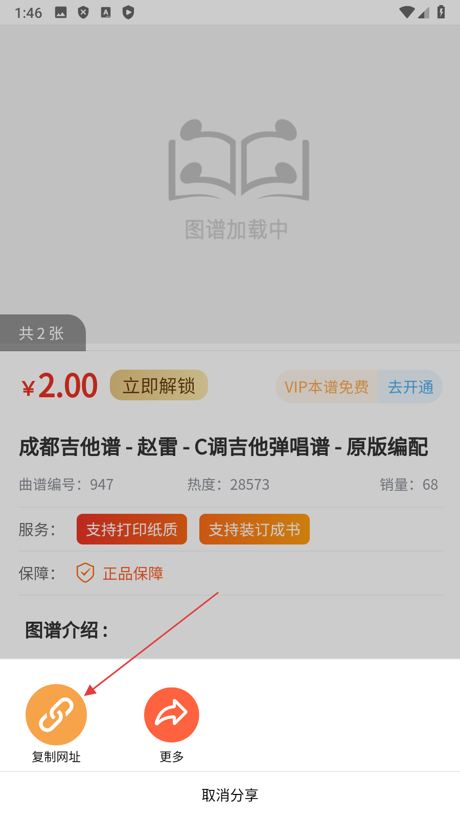 3、在吉他谱详情页面,点击【分享】,弹出分享选项菜单。