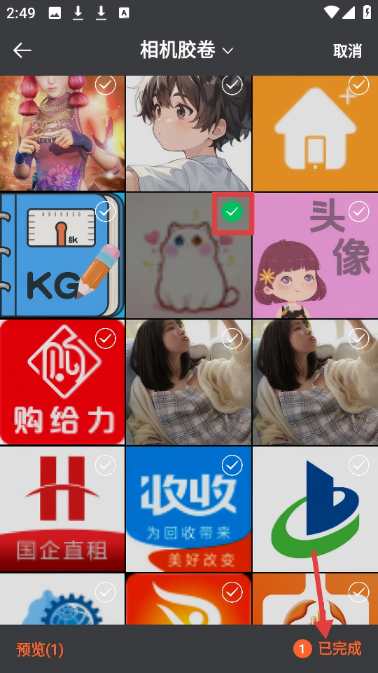 3、在相机胶卷中选择需要的图片,点击右下角【已完成】,完成图片导入。