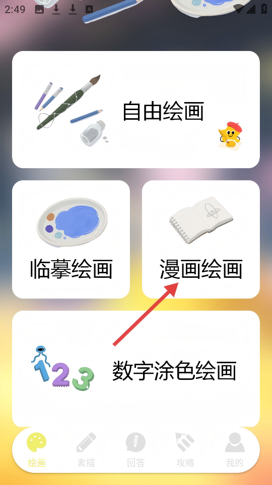 1、在绘画类型选择页面,点击【漫画绘画】选项,进入漫画绘画相关页面。